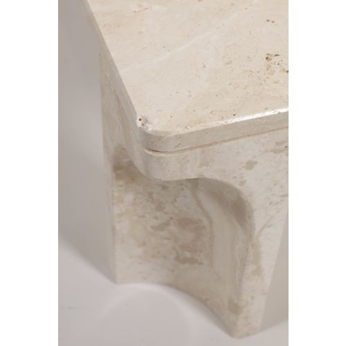 A wonderful and sculptural coffee table made of travertine. There is a dent in the corner of the table and the filler of the porous travertine top has broken in one place. However, the general appearance is neat. See the pictures. Listed and shipped by Finnish Design Shop. The item may ship without the original manufacturer's packaging.