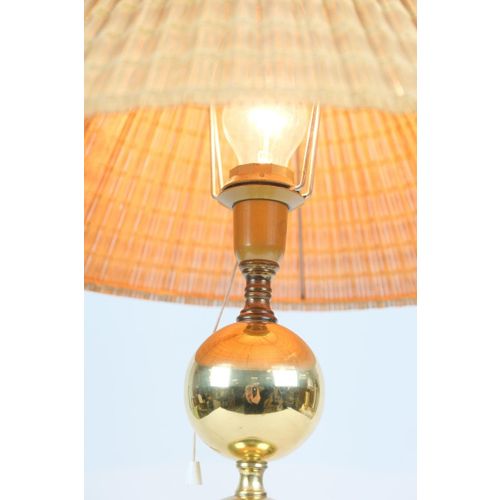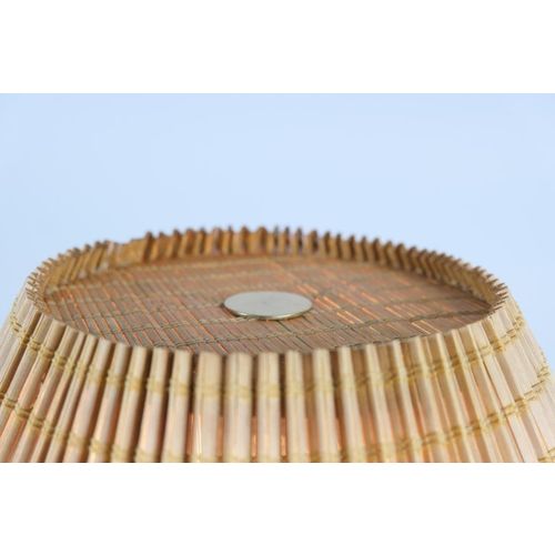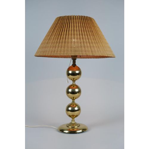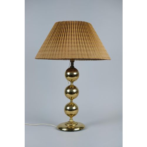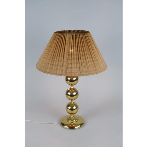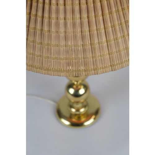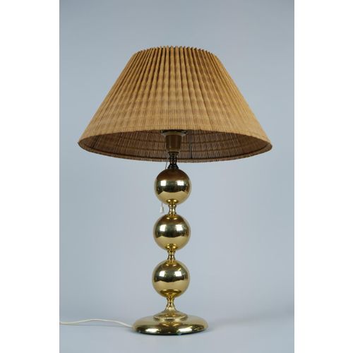 A large Mid-Century Modern brass table lamp with a wooden slate shade made by Valaisin Mäkelä oy. The lamp seems to be by Finnish lamp designer Kai Ruokonen (Finnmark) as we have a pair that are very similar and have the same parts as in this one yet carry the label of Designed by Kai Finnmark. It is also known that he designed for Valaisin Mäkelä. On all accounts, quite beautiful and sizable standing over 60cm tall.Read more