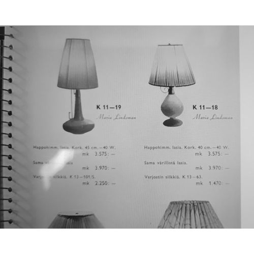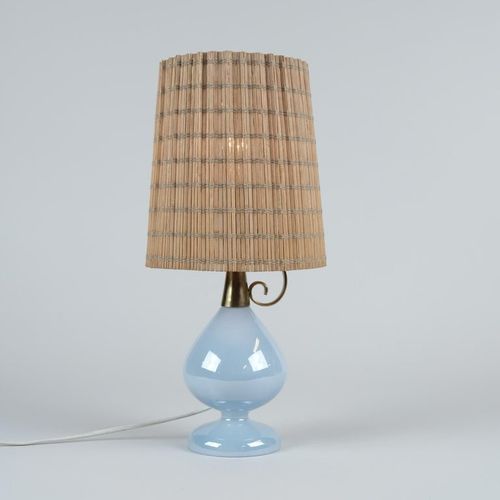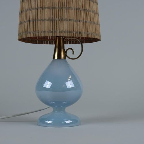 An oriental style delicate table lamp model K11-18 by Maria Lindeman for Idman from the 1950s. This rare, almost Aladin's lantern like lamp features a blown blue glass base with a brass top and handle. The rattan shade is of a later date. The lamp body is in it's original condition with the electric wiring seemingly changed at one point. Maria Lindemann graduated from the design school "Taideteollisuuskeskuskoulu", now known as the Aalto University School of Arts, Design, and Architecture just when the second world ended.Read more