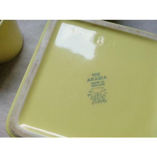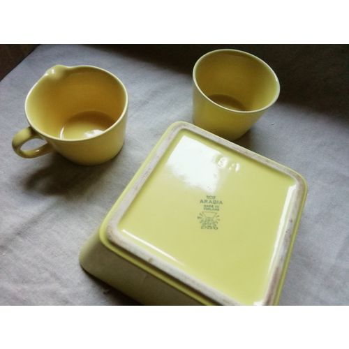 In good vintage condition, Arabia sugar bowl, creamer and saucer - 16.5cm square. Old production, the sugar bowl was without a lid. The sugar bowl is 6cm high, the creamer is also 6cm. Diameter 9cm.