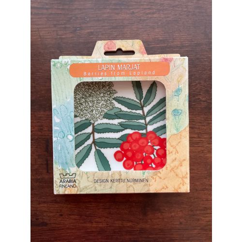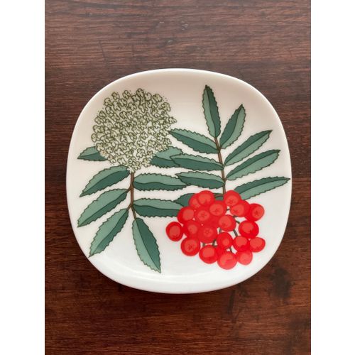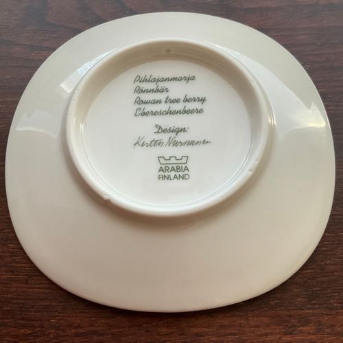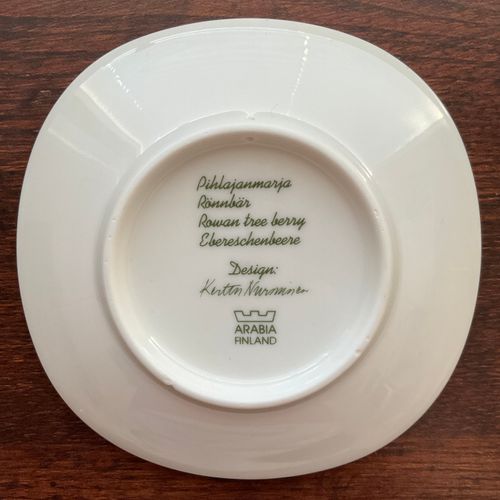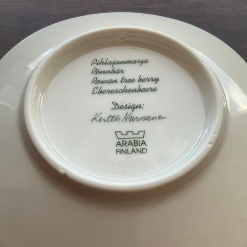 Arabia's Lapin berry series wall plate Pihlajanmarja, designer Kerttu Nurminen. A piece of the glaze on the bottom, approximately 2 x 4 mm, has chipped off from the back surface.