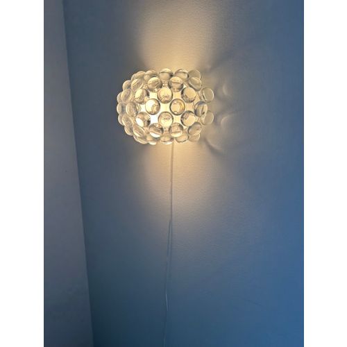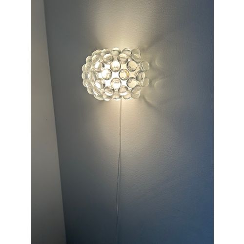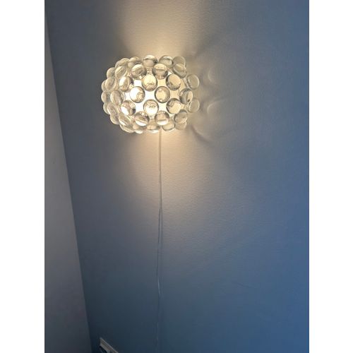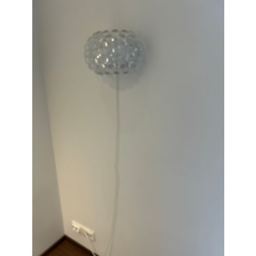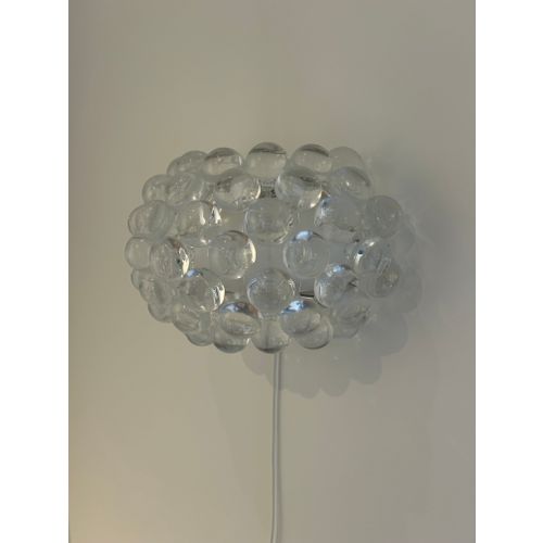 Patricia Urquiola and Eliana Gerotto designed the Caboche Plus Piccola lamp in 2006 for the Italian brand Foscarini. With its large, water-drop-like prisms, the lamp is as much a wall ornament as it is a light source. These prisms are made of translucent acrylic plastic, and together with the hand-blown white frosted glass interior, they create a reflective light that spreads softly throughout the room. The Caboche Plus Piccola is also available in a larger size.Read more