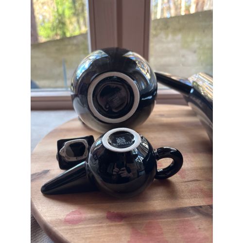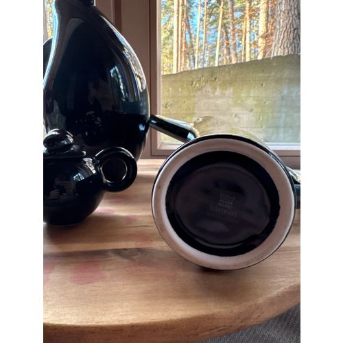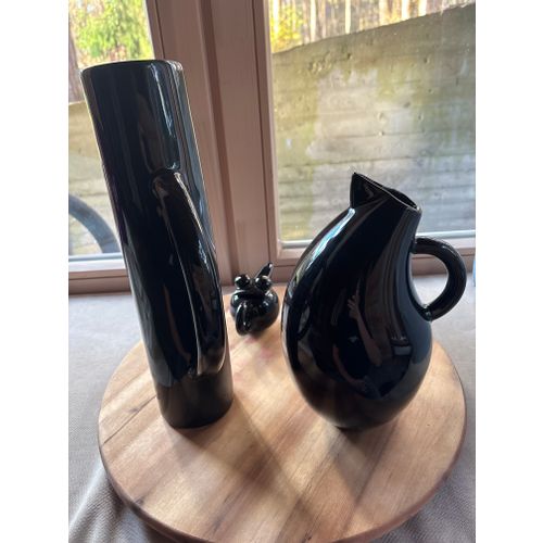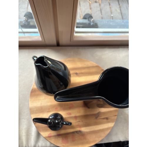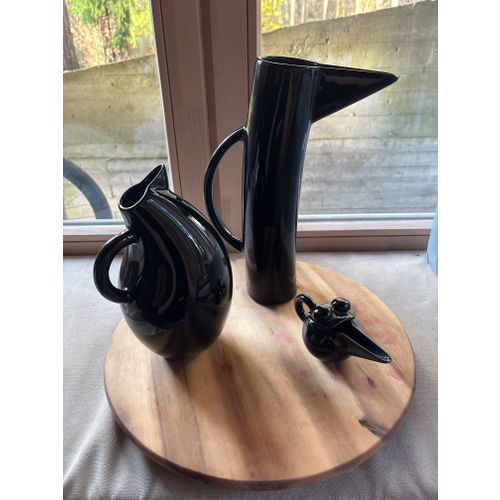 Beautiful set of three original Arabia Finland Storybirds in glossy black ceramic. Includes the tall pitcher, medium pitcher, and small bird figure. All pieces are in excellent condition and sold together as a complete set. A striking and collectible Scandinavian design trio.