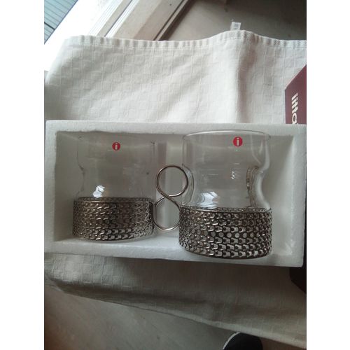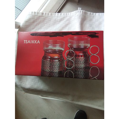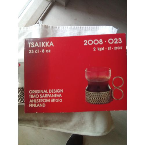 Despite their age, Tsaikka glasses are in very good condition, with stickers. I can't determine the age, but judging from the box, made by Iittala-Ahlström, we're going back decades. Slightly used. Original packaging, sturdy styrofoam box. Sorry for the marker marks, the late owner covered up his name and congratulatory texts.