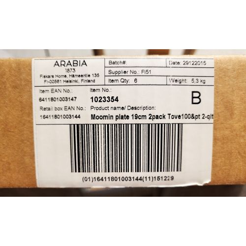 For sale packaging. Moomin collector plates, 2 plates. Blue painting Moomins and Tove 100 years on the plate "rillit". 10 series collector plates 3/10, 2016. The packaging differs from the other packaging in the series (shown in the pictures). Packaging information Arabia Fiskars Home, date 29.12.2015. Tove 100v. plate bottom protected with plastic and product label, Painting Moomins plate no plastic, no product label. Unused, stored in the packaging.Read more