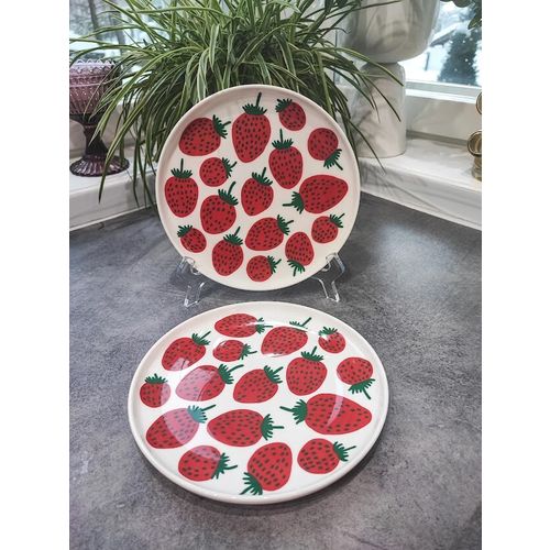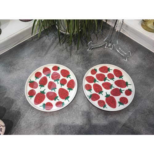 Unused, like-new Marimekko Strawberry plates, 2 pcs. The plates are B-quality and I found a small white dot on one (see last picture), which explains the B-quality. I can't find any difference on the other one from the A-quality.