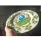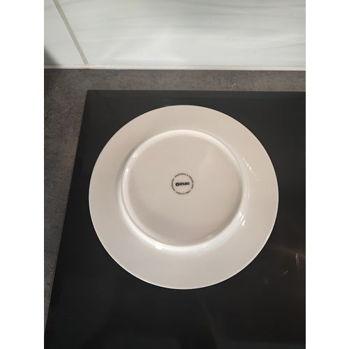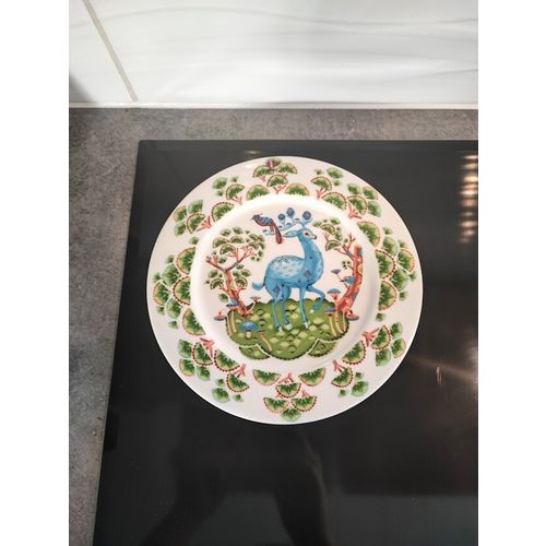 An intact, shiny, like-new Iittala Satumetsä plate that has been used once, with the i-label still in place.