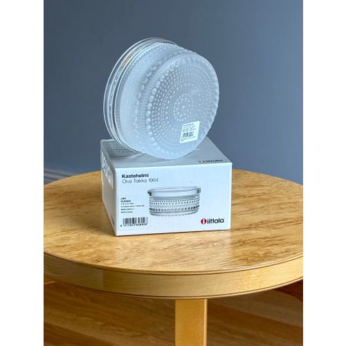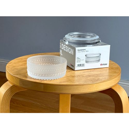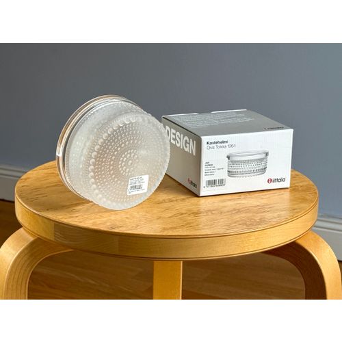 iittala Kastehelmi jar 116 x 57 mm, matt clear. Completely unused and in flawless condition, including original packaging and label. Shipping available on request.