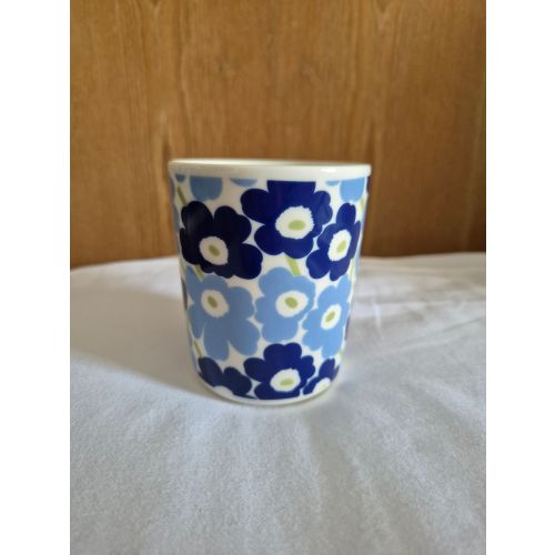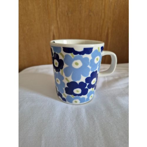 Marimekko poppy mug for sale. Capacity 2.5 dl. Unused, labels still attached. Made for the Asian market. The poppies are blue and the inside and stem are green.
