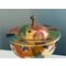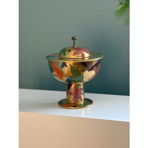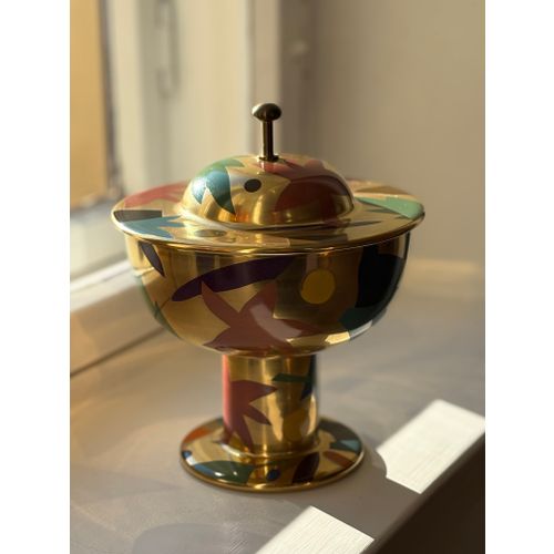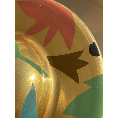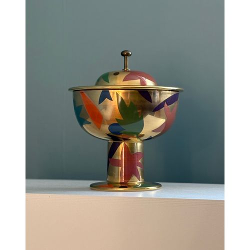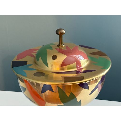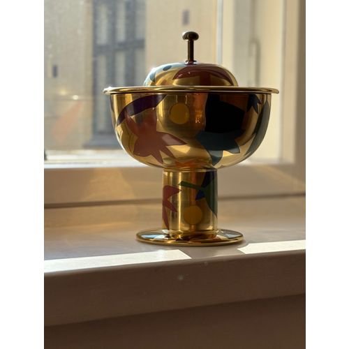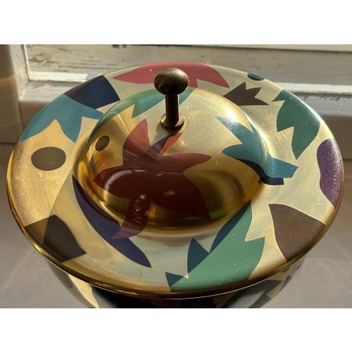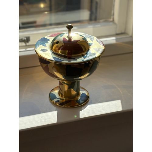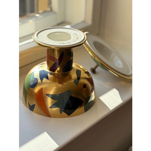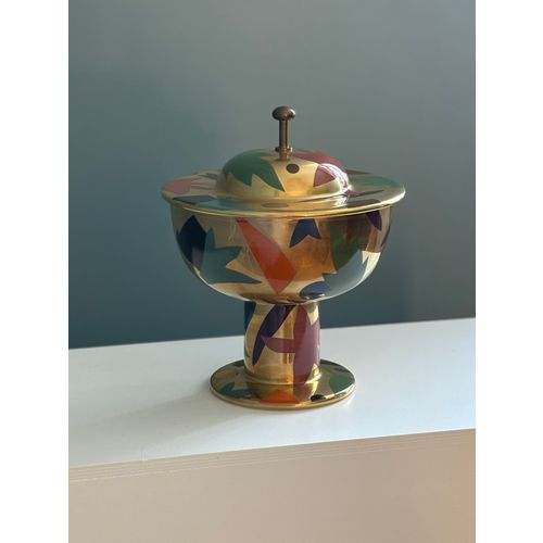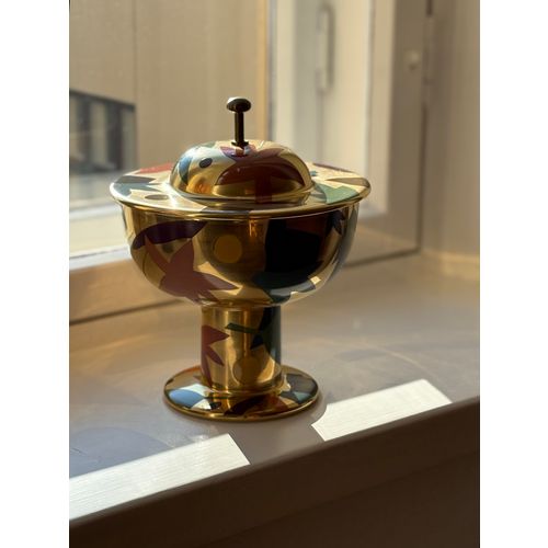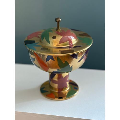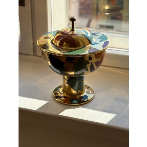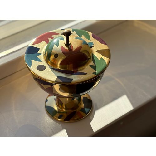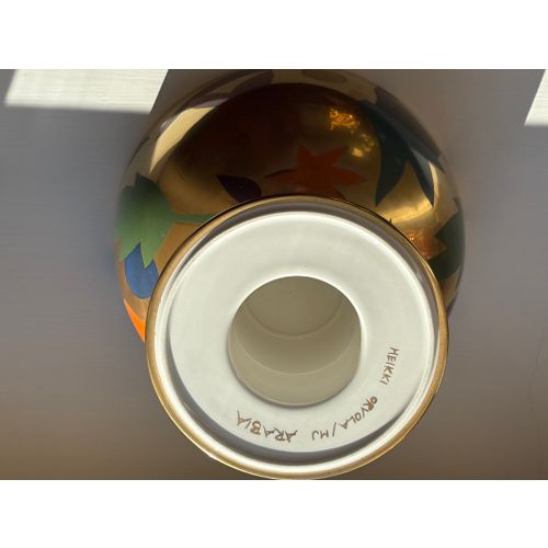 A stunning statement piece and a true eye-catcher in any interior. Heikki Orvola’s Kardinaali dates from 1988 and is part of the Arabia Pro Arte collection. The lidded bowl is richly decorated with a vibrant multicoloured design, beautifully enhanced by genuine gold detailing. The bowl is in good condition, with minor, insignificant signs of wear and a tiny loss to the decoration in one small area (see last image). Signed with the artist’s name.Read more