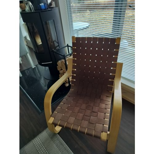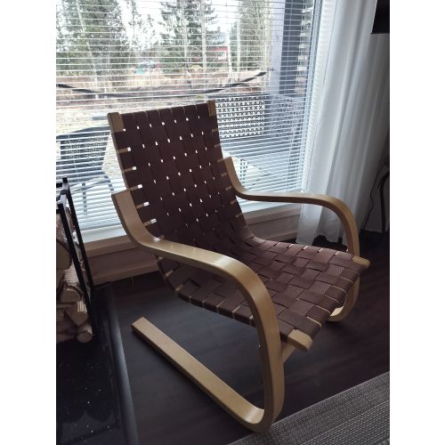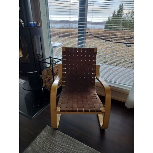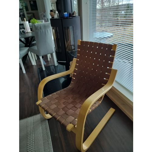Artek 406 saddle belt armchair birch/brown. A little worn but mostly in really good condition. From the 80s. Transport in the Tampere area can also be arranged.