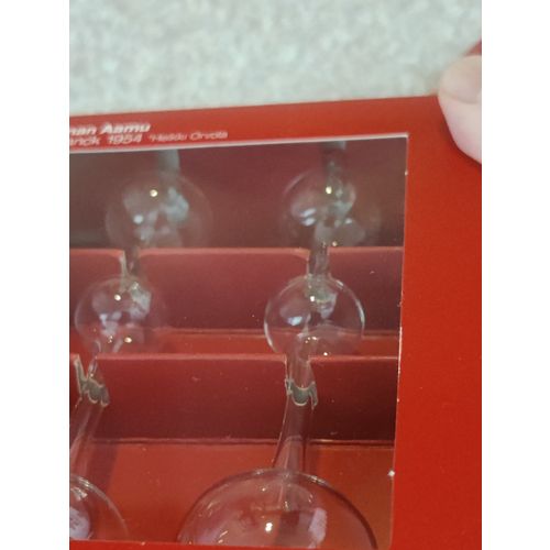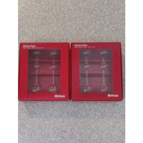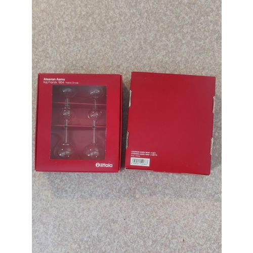 Unused Ateenan Aamu Mini Christmas tree ornaments from Iittala with original red hanging ribbon. Delivered in original packaging. Selling 2 sets in one listing, totaling 4 Christmas tree ornaments.