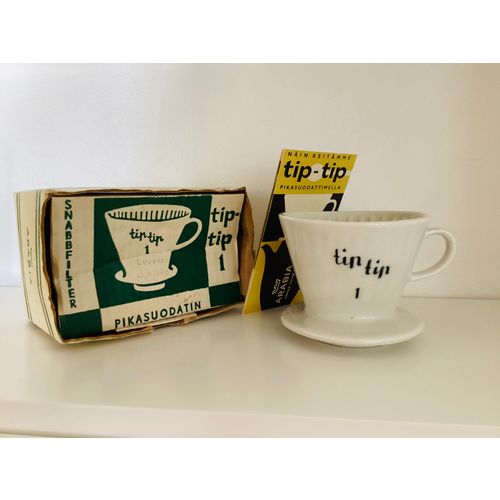 Tip tip kahvisuodatin on käyttämätön, siisti, alkuperäisessä pakkauksessa käyttöohjeineen. Pakkauksessa tekstit : Pikasuodatin, luuväri, Hyvän kahvin ystäville ja För Vänner av gott kaffe. Arabia. Pakkauksessa näkyy tuotteen ikä ja käytönjälkiä.