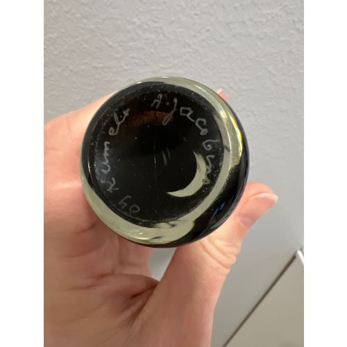 Upea musta signeerattu Kissa lasifiguuri. Kissan korvienvälissä pientä naarmua pinnassa, muutoin täysin ehjä.