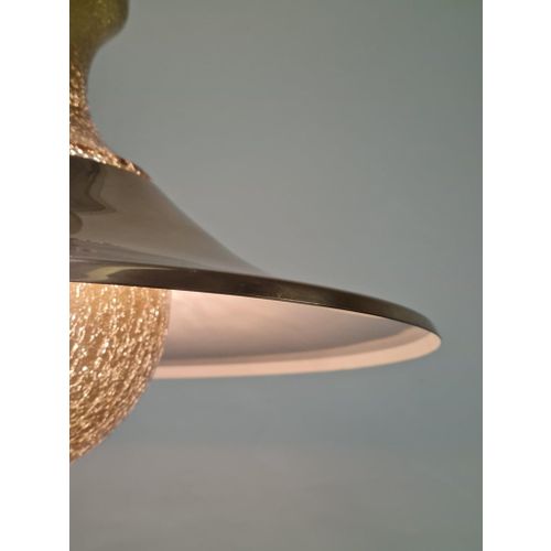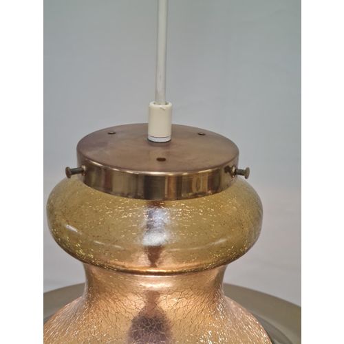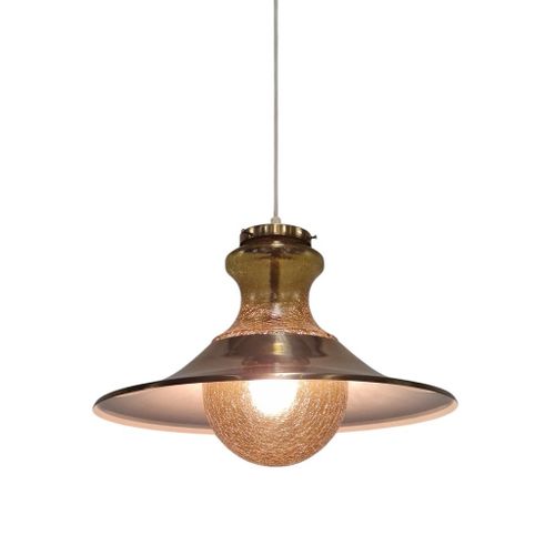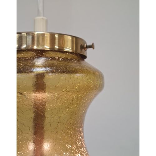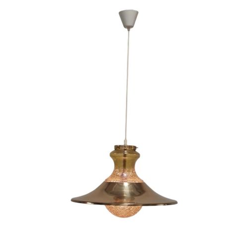 Skandinaavinen meripihkan värinen särölasinen kuplariippuvalaisin messinkivarjostimella, 1970-luku