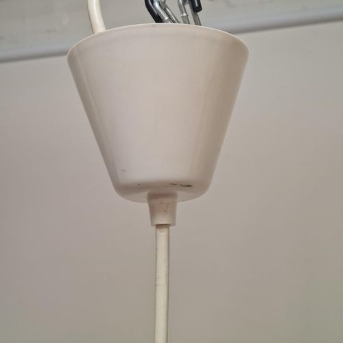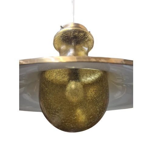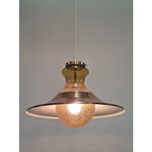 Suuri yksivaloinen riippuvalaisin, jossa on kauniista särölasista valmistettu kuplanmuotoinen varjostin ja sen päällä messinkinen hajotusvarjostin. Muotoilu tuo mieleen laivalamput, mutta modernilla twistillä. Valaisimen suunnittelijaa tai valmistajaa ei valitettavasti tunneta, mutta se on erittäin korkealaatuinen ja lähes varmasti skandinaavista alkuperää. Sopii monenlaisiin tiloihin, erityisesti keittiöihin ja eteisiin. Valaisin on hyvässä kunnossa.