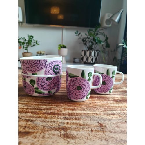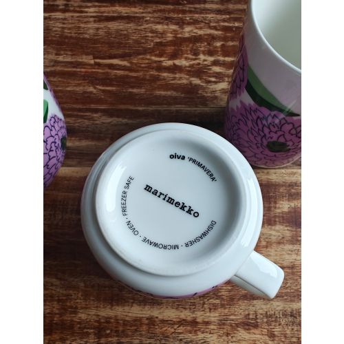 Oiva - Primavera kulho 5 dl, valkoinen-liila-vihreä 2 kpl ja saman sarjan Oiva Primavera mukeja