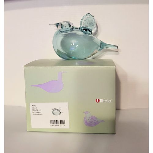 Oiva Toikka Iittala siivekäs pieni lintu. Väri vaaleanvihreä vartalo pienet siivet ja kirkas pää/nokka. Mitat 115 x 70mm. Signeerattu O.Toikka Iittala. Pohjassa myös tuote ja I-tarra, tehtaan pakkauksessa säilytetty. Ei tuotannossa.