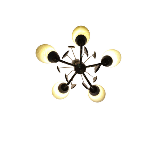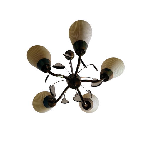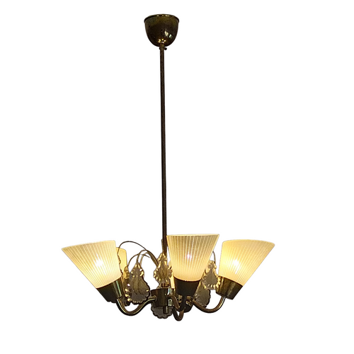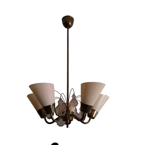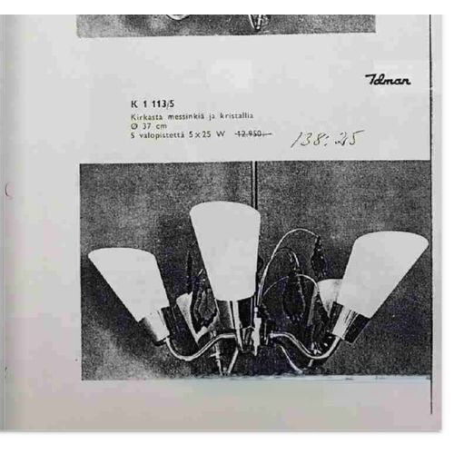 Kauniisti patinoitunut Idmanin valmistama viisihaarainen kattovalaisin savukristalleilla ja opaalilasi kuvuilla. Löytyy vuoden 1961 kuvastosta. Suunnittelijaa ei ole mainittu, mutta yleisesti Idmanin luettelossa esiintyvät valaisimet joissa ei ole mainittu suunnittelijaa ovat oletettavasti Mauri Almarin suunnittelemia.