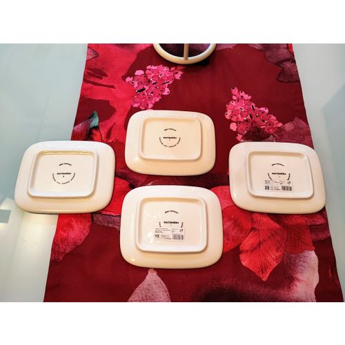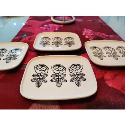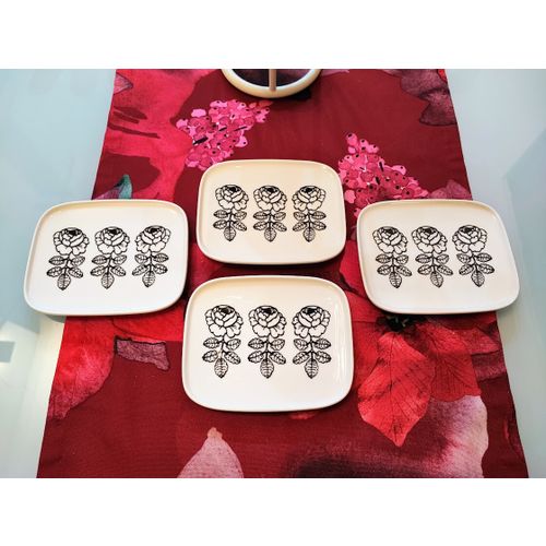 Kerran juhlissa käytössä olleet, erittäin hyväkuntoiset mustavalkoiset Vihkiruusu-lautase 4kpl. Lautaset ovat b-laatuiset. Syytä b-laadulle en löydä, vaikka kuinka näitä vertaan a-laatuisiin.