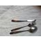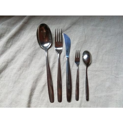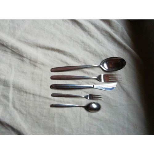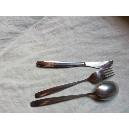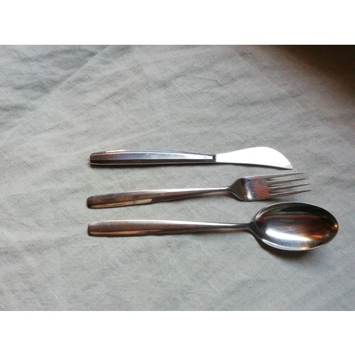 Veitsi 18 cm, haarukka 19 cm, ruokalusikka 19,7 cm. Pieni haarukka. Kahvilusikka: 13 cm. Kaikki aterimet erittäin hyvässä kunnossa.