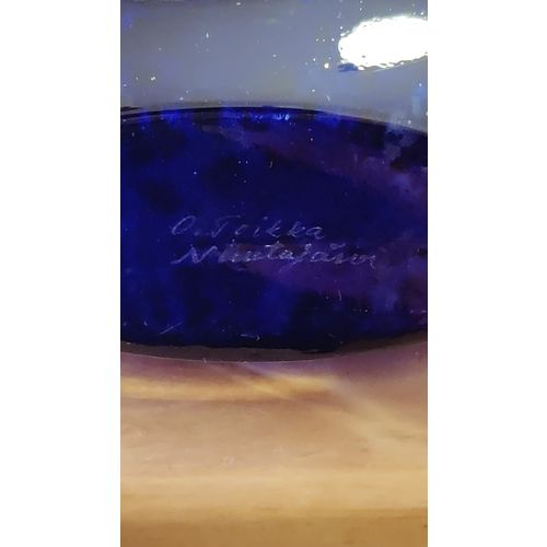 Hyväkuntoinen Nuutajärven puhallettu taidelasipullo. Valmistettu 1984-87 Signeeraus pohjassa. Suunnittelija: Oiva Toikka Leveys: 10,5 cm Paino: 225 g
