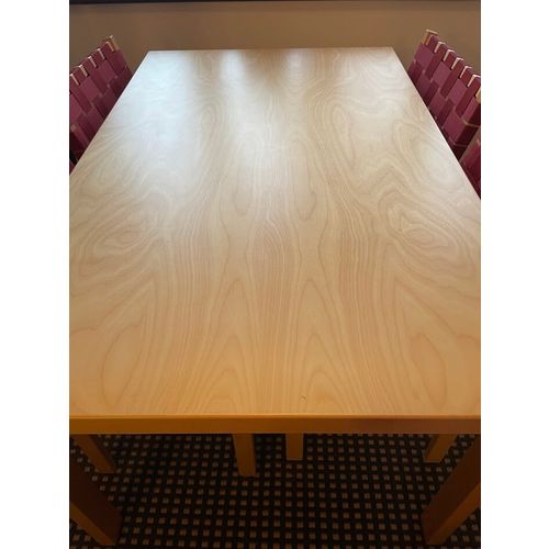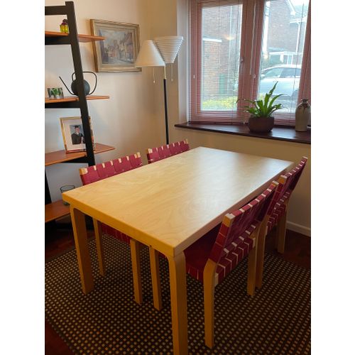 Artek Aalto -pöytä 82B ja Artek Aalto -tuolit 4 kpl 611 ovat uudenveroisessa kunnossa. Alvar Aallon Artekille vuonna 1933 suunnittelema Aalto-pöytä edustaa minimalistista ja ikonista skandinaavista muotoilua. Se on valmistettu korkealaatuisesta luonnonkoivusta, jonka pinta on massiivikoivua. Vallankumouksellisella tavalla L-taivutetut jalat on kiinnitetty suoraan pöydän alapintaan, mikä tekee rakenteesta yksinkertaisen mutta erittäin tukevan.Lue lisää