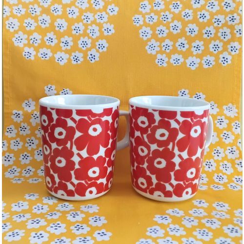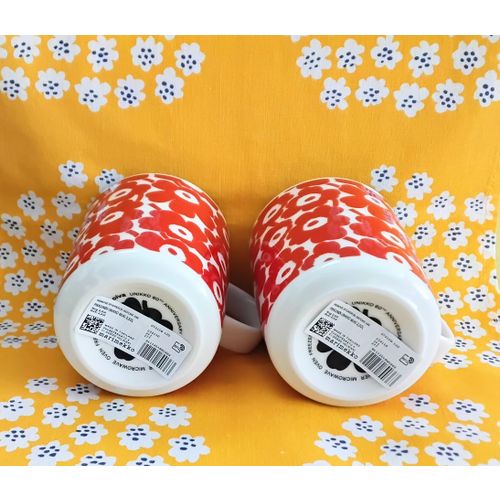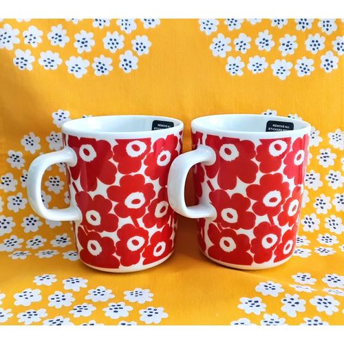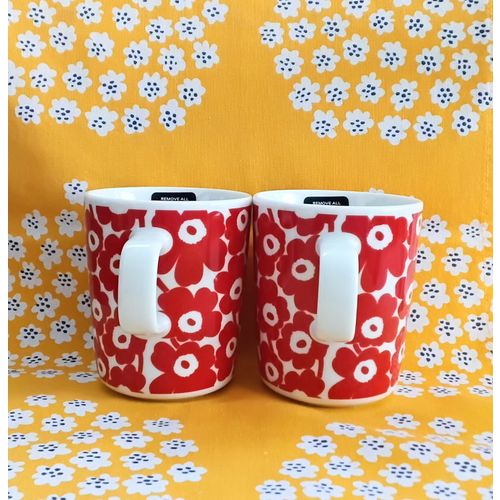 Erittäin kauniit Marimekon pikku Unikko kuvilla olevat mukit 2kpl, väritys punainen / valkoinen. Alkuperäiset tarrat, huom. tarran alla musta Unikko kuva. Käyttämätön. Ei tuotannossa.