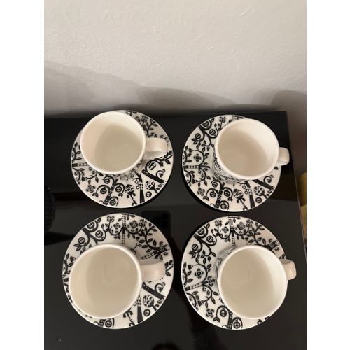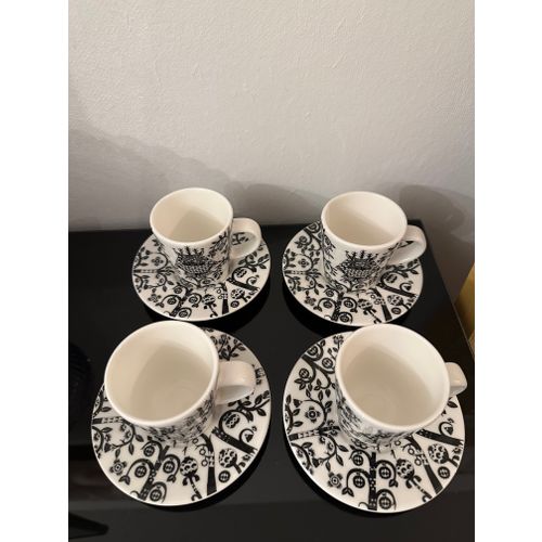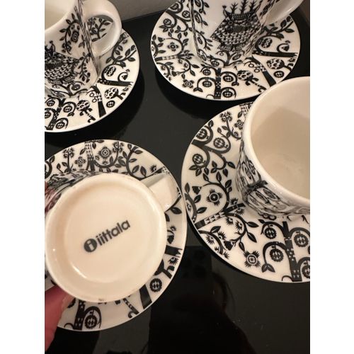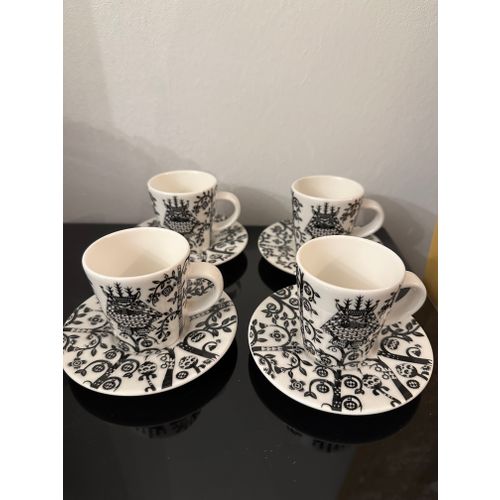 4 kappaleen setti Iittalan Taika -sarjaan kuuluvia espressokuppeja ja -lautasia. En löytänyt kunnosta mitään huomautettavaa.