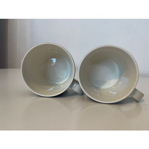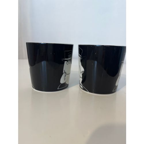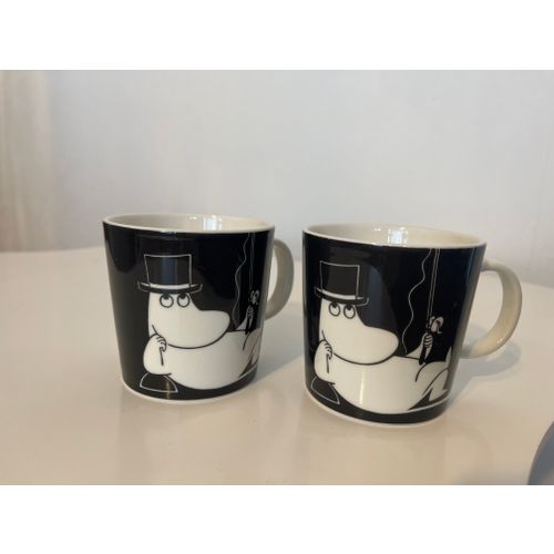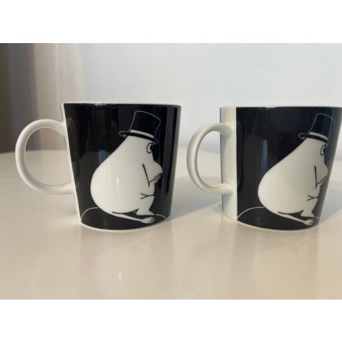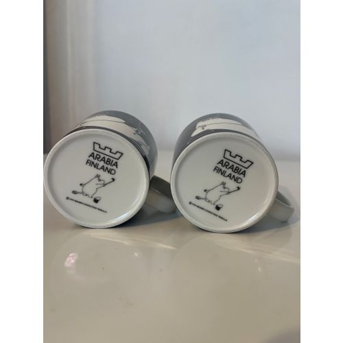 Muumipappa tuumailee mukeja kaksi kappaletta. Arabian kruunu- ja vuosileimat pohjassa. Omassa käytössä, joten joitakin käytön merkkejä näkyy, ja 1990-luvun mukeissa on myös tyypillisesti lasitusvirheitä.