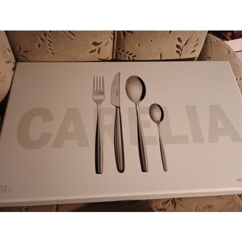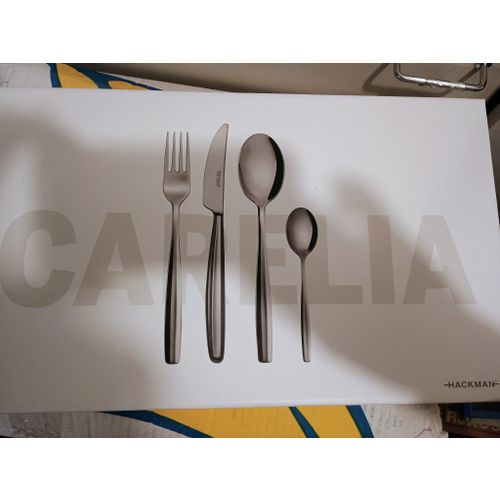 Hackman Carelia aterinsetti 24 osainen 6 ruokalusikkaa 6 ruokaveistä 6 ruokahaarukkaa 6kahvilusikkaa Alkuperäisessä kovakantisessa laatikossaan Käyttämätön setti
